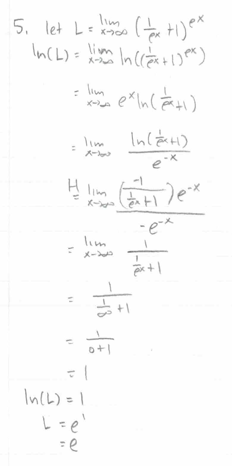Q5: Compute \(\lim_{x \to \infty} \left(\frac{1}{e^{x}}+1\right)^{e^{x}}\).